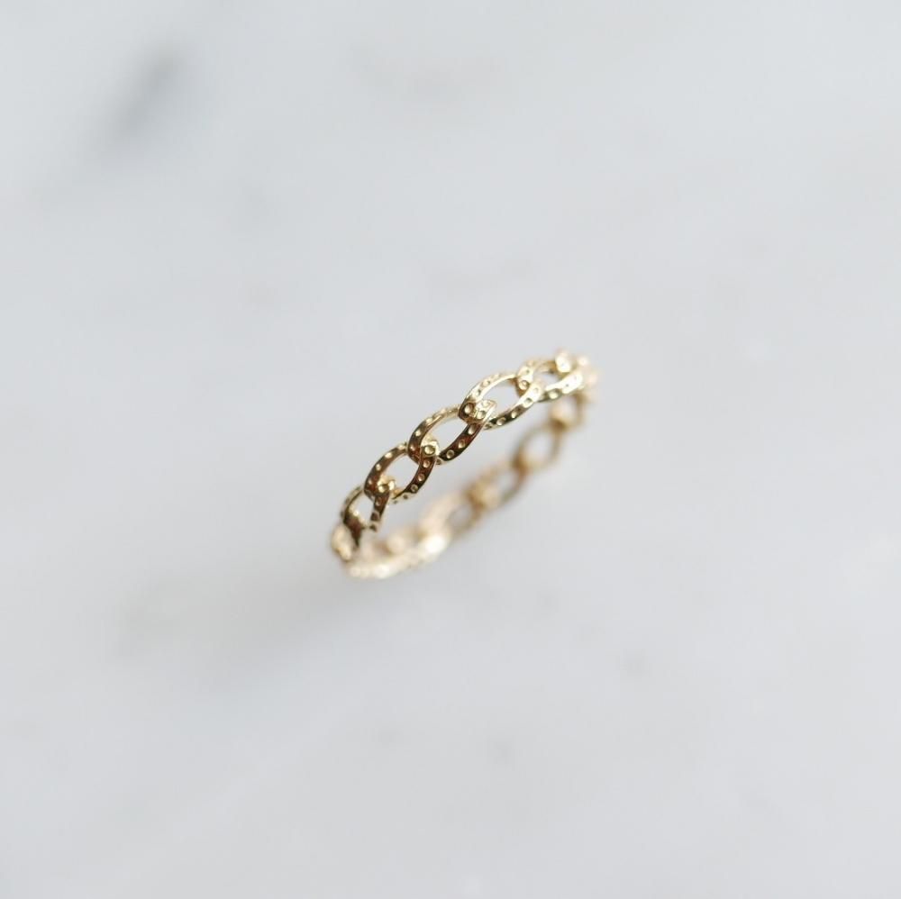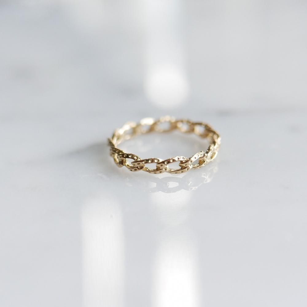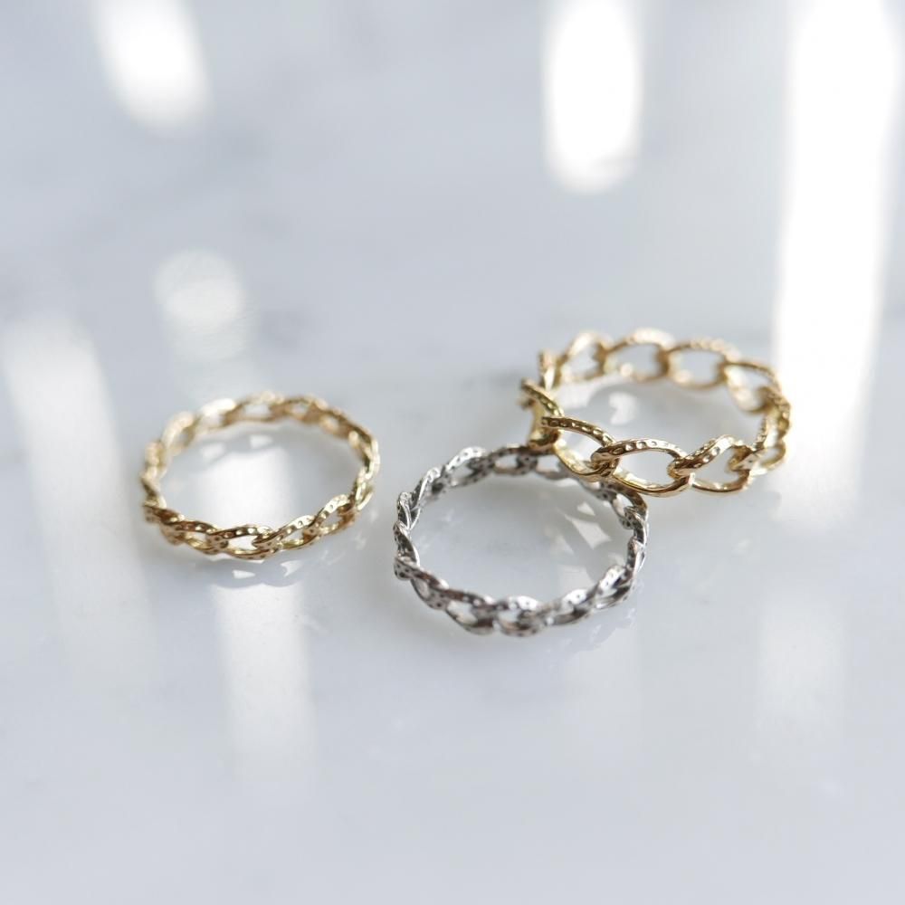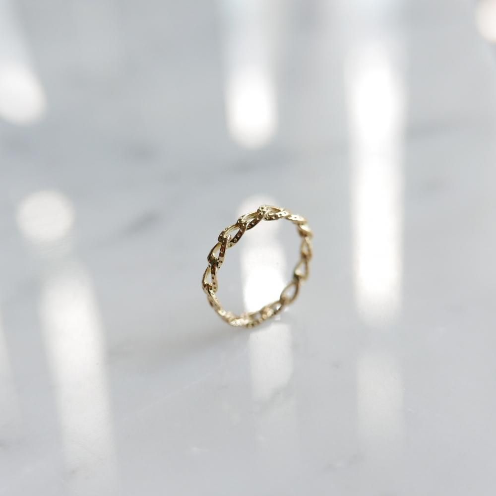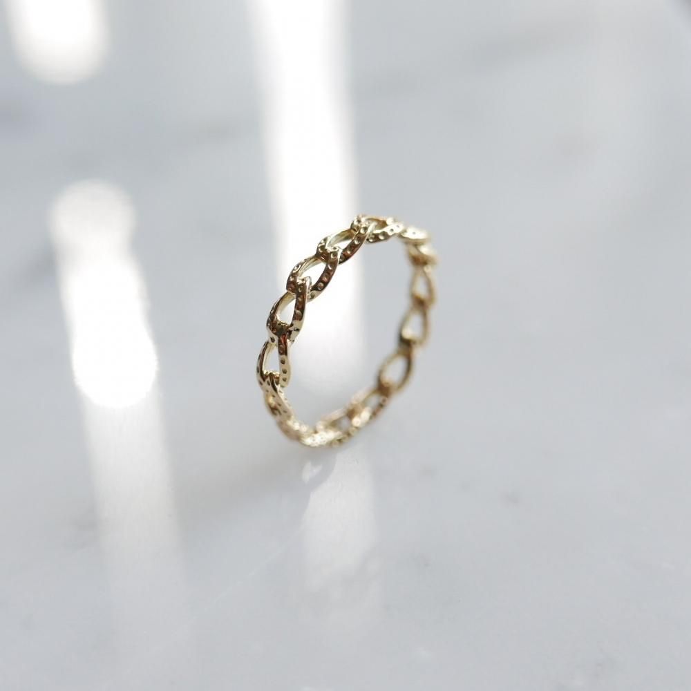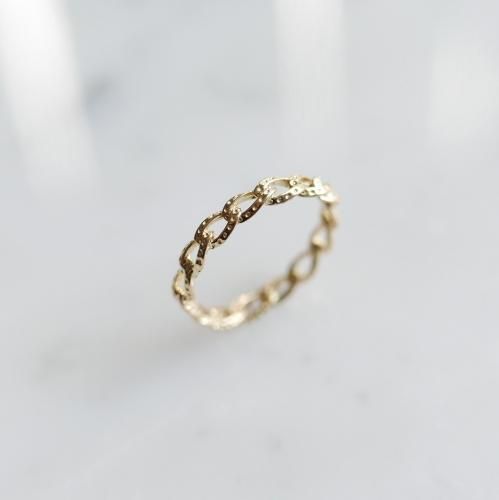 小ぶりなチェーンを形どった18金のリング。 シリーズの<チェーンリングワイド>と比べると細めなので繊細なリングとの重ね使いもおすすめです。