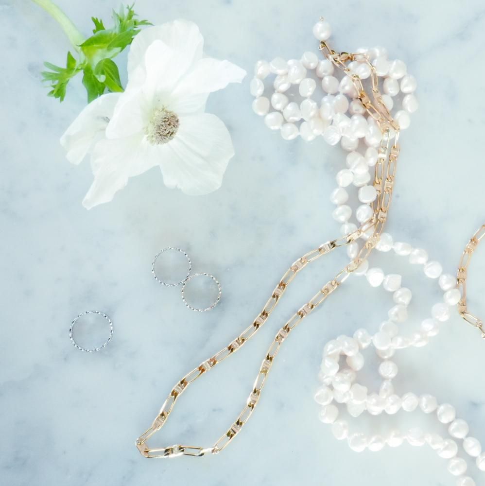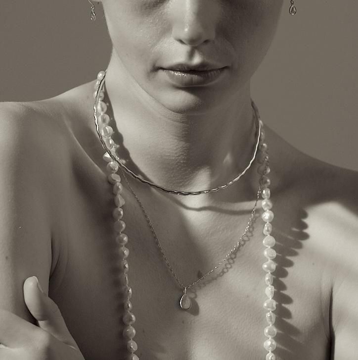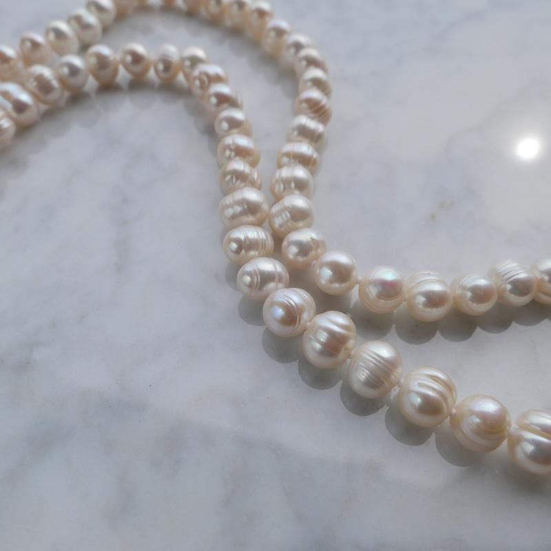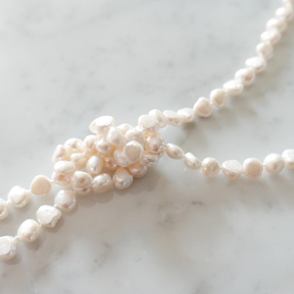 パール一粒一粒の間隔に丁寧にナッツ留め(玉留め)を施しており、しなやかな動きが美しい ネックレス。 留め具がないため金属アレルギーの方にも嬉しい仕様となっています。